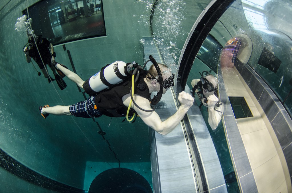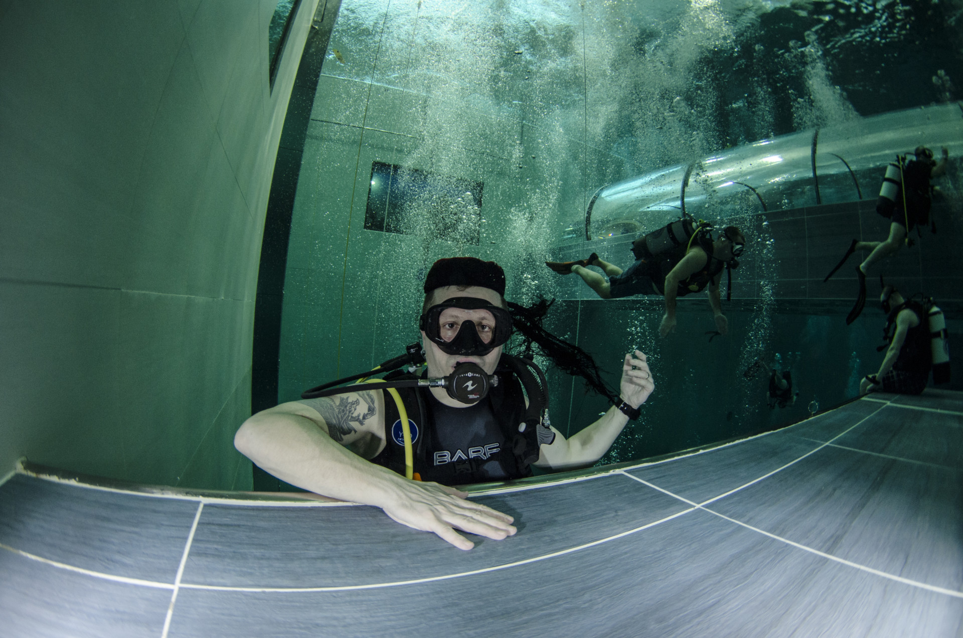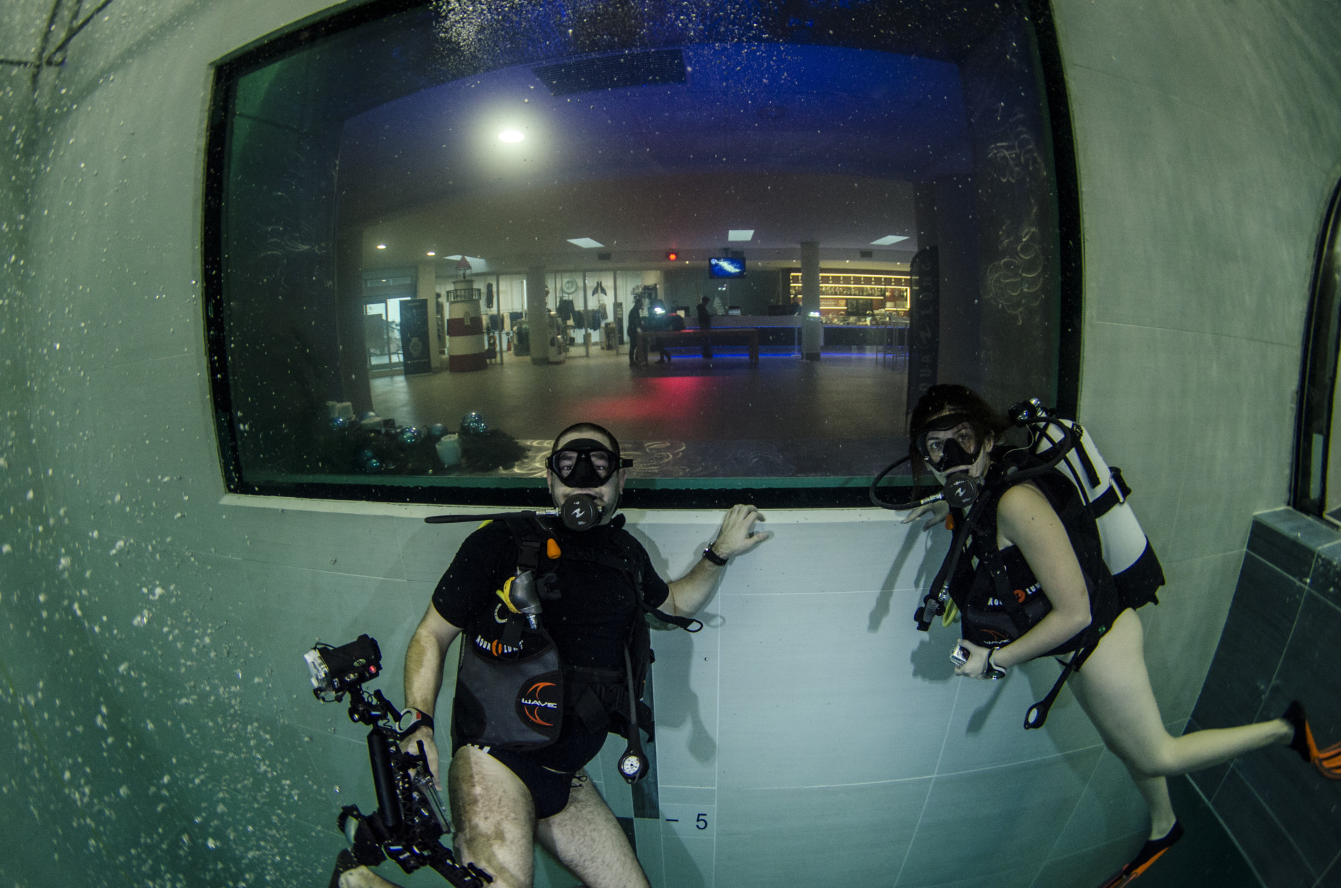 Izletili smo iz busa kao djeca iz škole i direkt u dućan s majicama i oskudnom ponudom suvenira, kao na svakom maturalcu. Nakon brzinskog pregledavanja pretprostora i prozirnog tunela koji prolazi kroz bazen uslijedio je check in na recepciji i osnovne upute gdje da navučemo svoje kupaće gače koje su nam danas glumile ronilačka odjela. Jer voda u bazenu je toplih 32 stupnja, a maksimalna dubina 42 metra, prozirnost savršena! Najmanje opreme ikad! Maska, komp i kupaće. Mogao sam doslovno sve u pederušu spakirat (da u njoj nemam nož, nožić, daskicu za rezanje, kilu špeka, butelju s pripadajućim otvaračem, pljosku i pol kubika papirnatih maramica..sam spomenul veći nož?). Srećom da je s nama bila naša poliglotkinja (jel se tak veli ili poliglotica?) Blanka koja osim azerbeđanskog, svahilija, urdu, arapskog i mađarskog te američkog čisto govori i njemački, austrijski, ruski, osječki...i talijanski jezik, za razliku od našeg domaćina. Ali pošto smo mi svi ronilačke iskusnjare s preko nekoliko zarona brzo smo pokopčali kaj ova zimska, preplanula, talijanska inačica Miča Bjukenana hoće od nas. Montiranje opreme i buć u ugodno topli bazen. Kakva razlika u odnosu na Novogodišnje jutro sneno i muuutnooo! U suharku očevooom, malčice podeeranooom! Ja skočio sam u Jarun!!