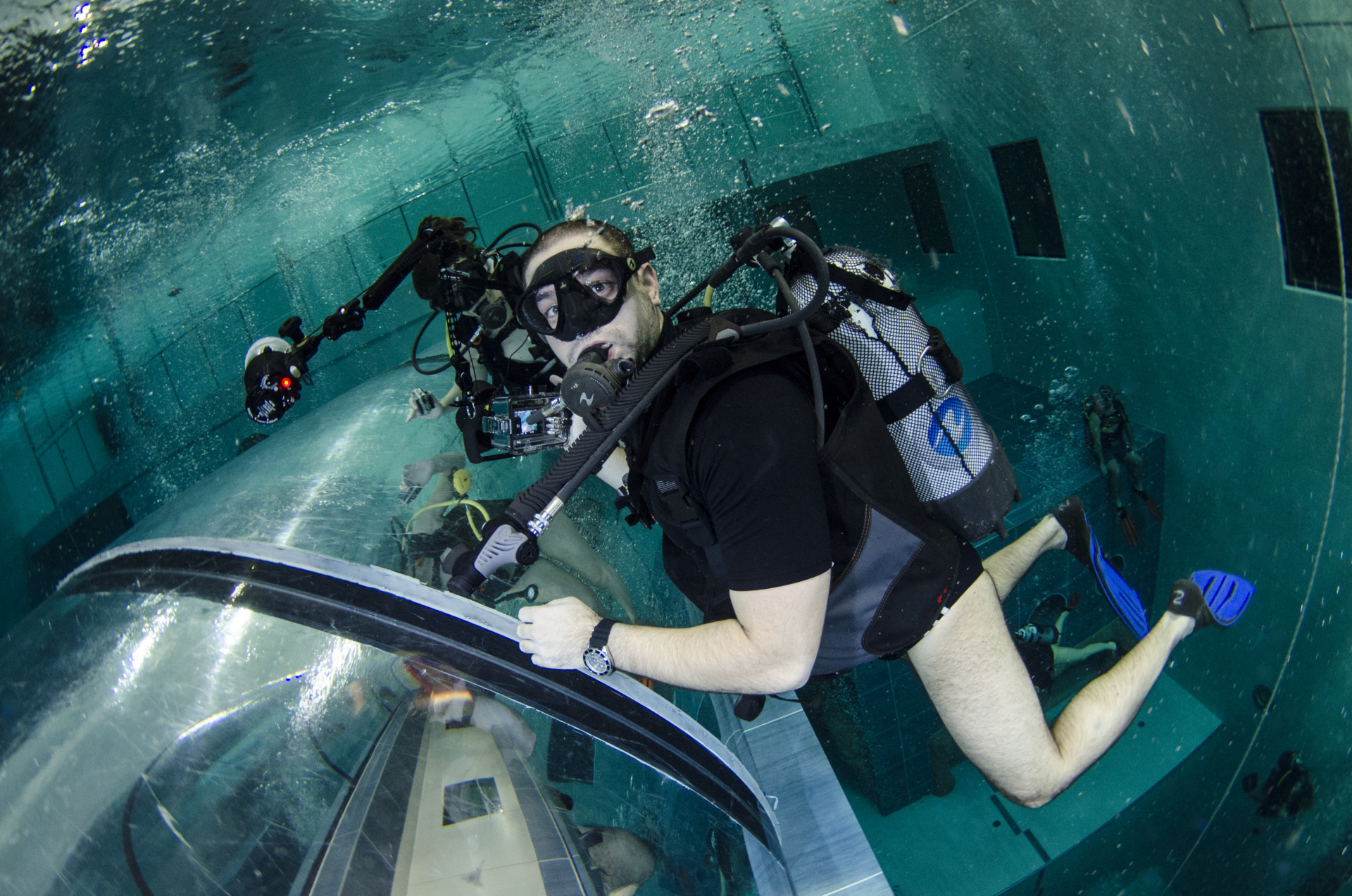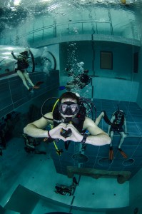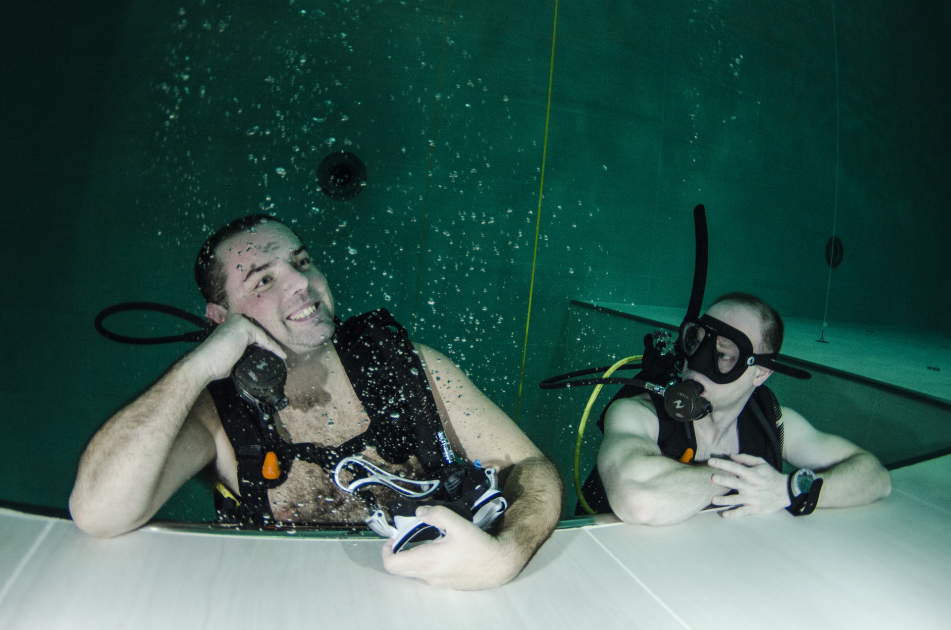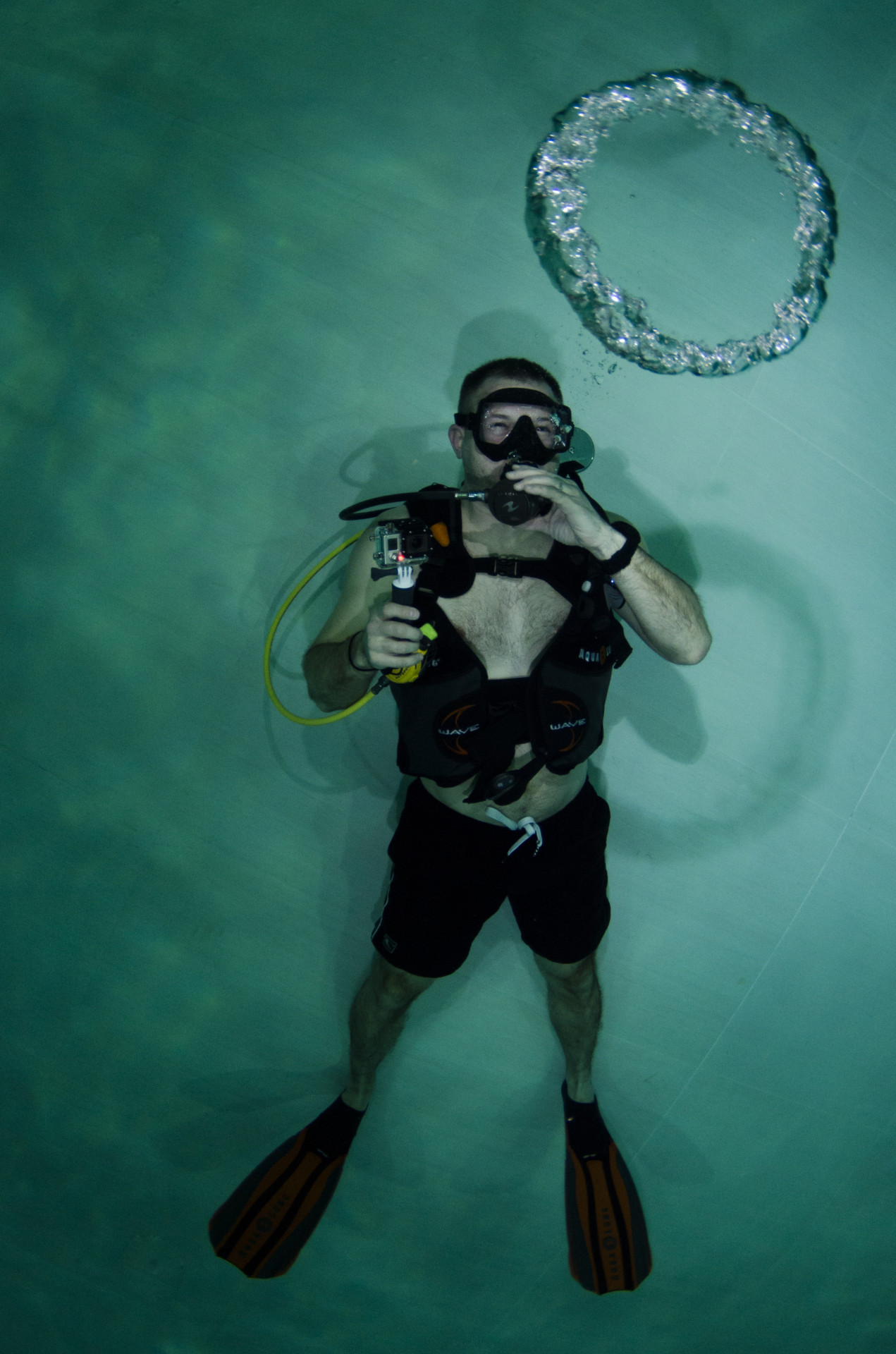 Izletili smo iz busa kao djeca iz škole i direkt u dućan s majicama i oskudnom ponudom suvenira, kao na svakom maturalcu. Nakon brzinskog pregledavanja pretprostora i prozirnog tunela koji prolazi kroz bazen uslijedio je check in na recepciji i osnovne upute gdje da navučemo svoje kupaće gače koje su nam danas glumile ronilačka odjela. Jer voda u bazenu je toplih 32 stupnja, a maksimalna dubina 42 metra, prozirnost savršena! Najmanje opreme ikad! Maska, komp i kupaće. Mogao sam doslovno sve u pederušu spakirat (da u njoj nemam nož, nožić, daskicu za rezanje, kilu špeka, butelju s pripadajućim otvaračem, pljosku i pol kubika papirnatih maramica..sam spomenul veći nož?). Srećom da je s nama bila naša poliglotkinja (jel se tak veli ili poliglotica?) Blanka koja osim azerbeđanskog, svahilija, urdu, arapskog i mađarskog te američkog čisto govori i njemački, austrijski, ruski, osječki...i talijanski jezik, za razliku od našeg domaćina. Ali pošto smo mi svi ronilačke iskusnjare s preko nekoliko zarona brzo smo pokopčali kaj ova zimska, preplanula, talijanska inačica Miča Bjukenana hoće od nas. Montiranje opreme i buć u ugodno topli bazen. Kakva razlika u odnosu na Novogodišnje jutro sneno i muuutnooo! U suharku očevooom, malčice podeeranooom! Ja skočio sam u Jarun!!