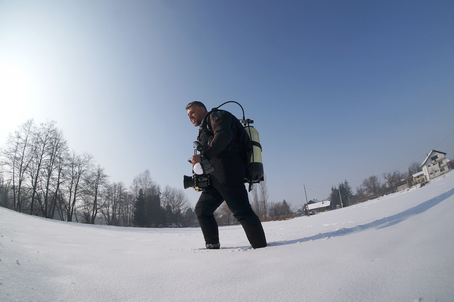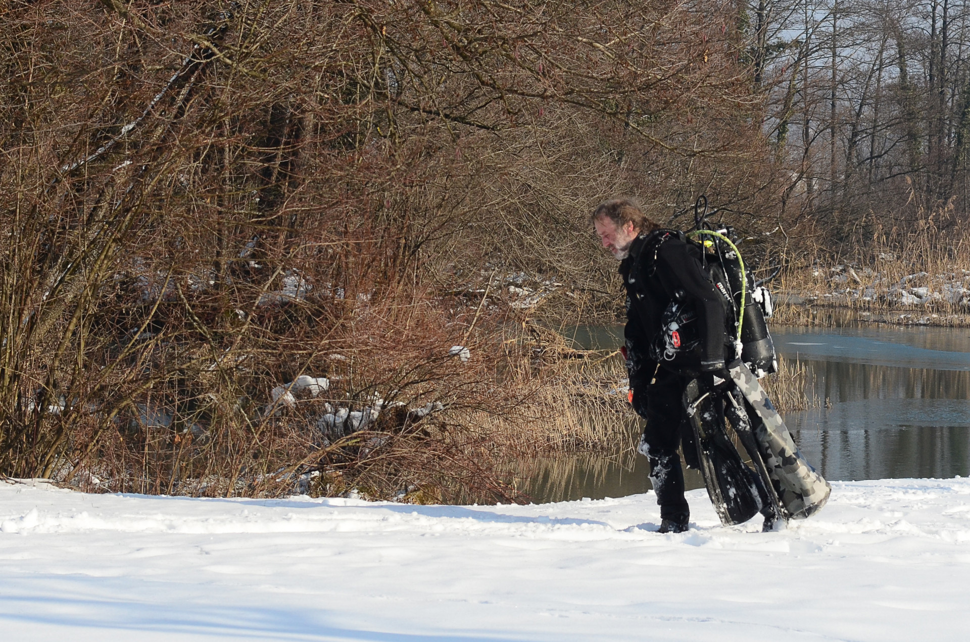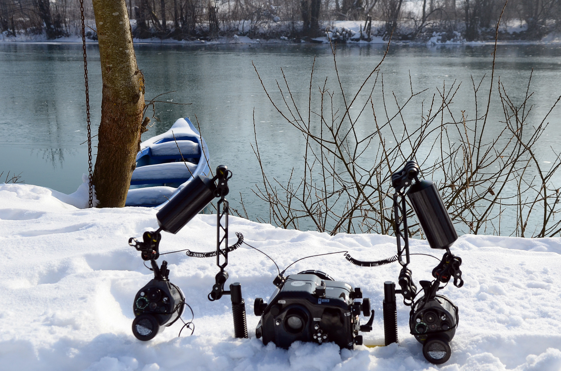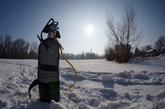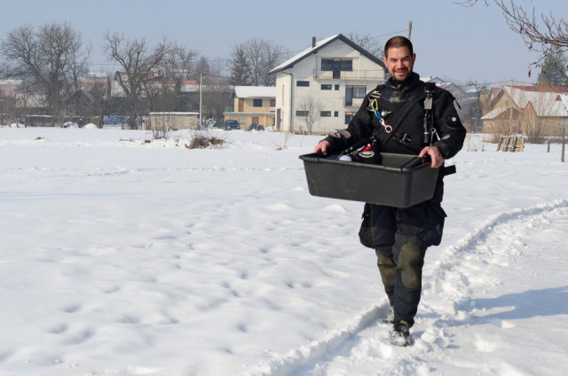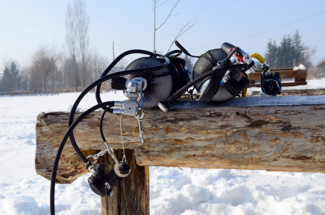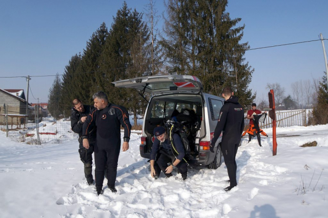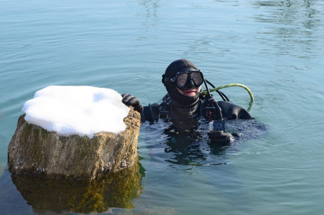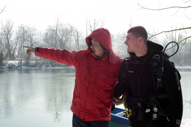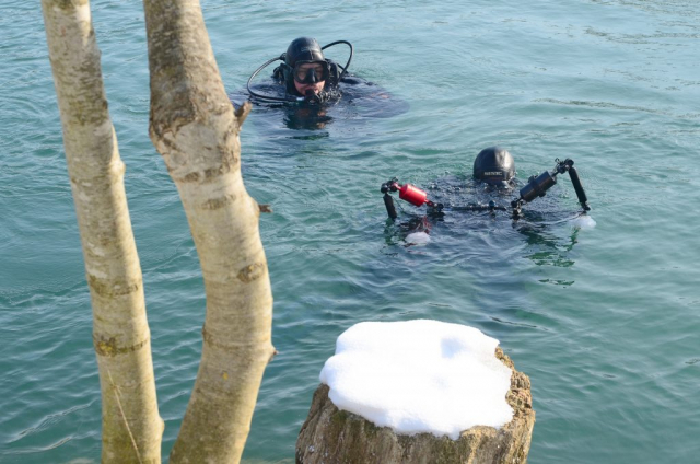 Naravno, iskrcala se i foto oprema. Jake snage podvodne fotografije brižno su posložile svoje fotoaparate na čeku uz rub jezera. Nick zvani Cave, u nedostatku špilje ili prikladne rupe u koju se može potrpat neki foto-model, bacio je pogled na obližnji panj koji je stršao iz rijeke. Odlično! Nakon uskakanja u vodu branio ga je ko golman u prvoj ligi. Vrana je više proučavao eko-sustav i bavio se videografijom, dok na kraju nije isprovocirao nekog jadnog raka, jedino zapaženo stvorenje na dotičnom zaronu...Oko sokolovo, Nikica, ko kobac je brojao mjehuriće s obale...Dugorešaninu Romanu ovo je sve bilo mačji kašalj, odradio je to junački, u mokrom odijelcetu..