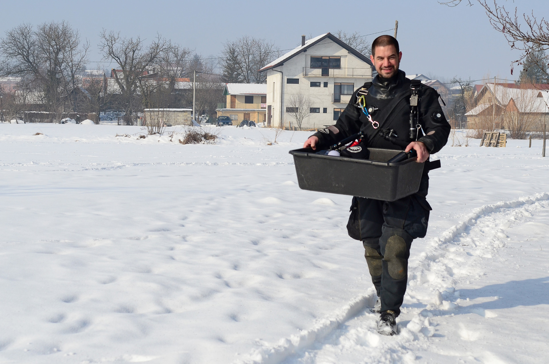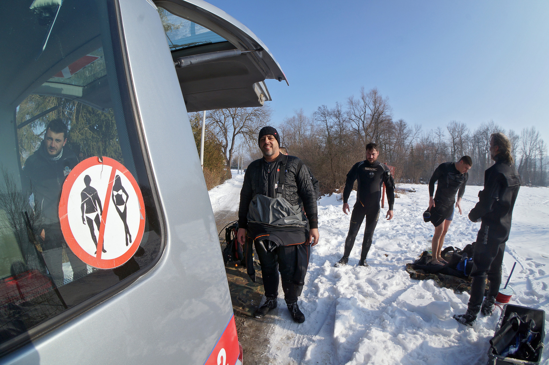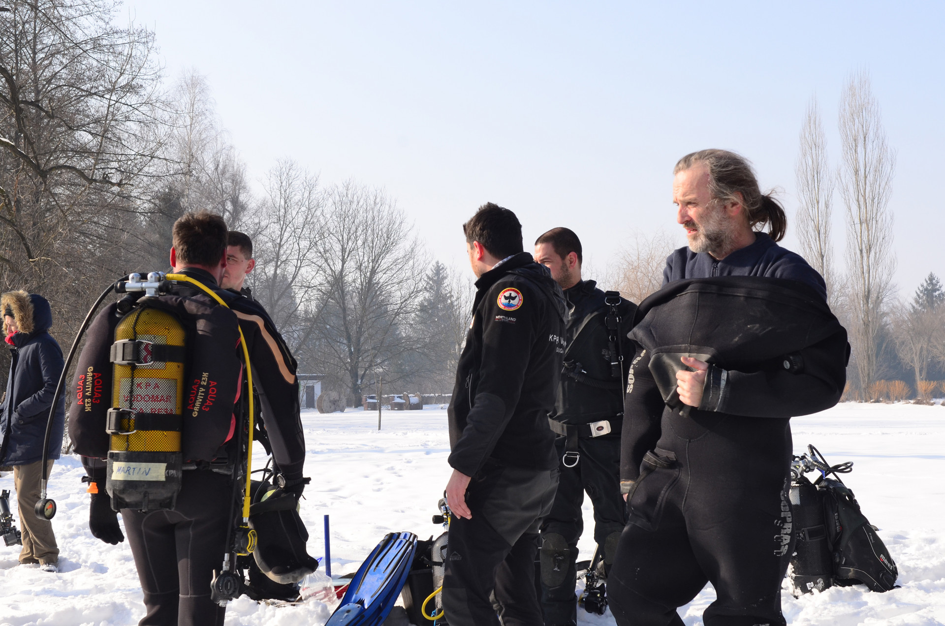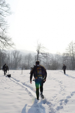 Nakon podužih skini-obuci priprema, slaganja ronilačke opreme, kave i opuštanja, uđosmo svi u kombi i uz malo kruženje po dugoreškom kraju, iskrcaše nas na Veseloj livadi. Svi su se razveselili kad su dobili lopatu u ruke kako bi probili puteljak kroz snijeg. Zato se valjda i zove Vesela livada...