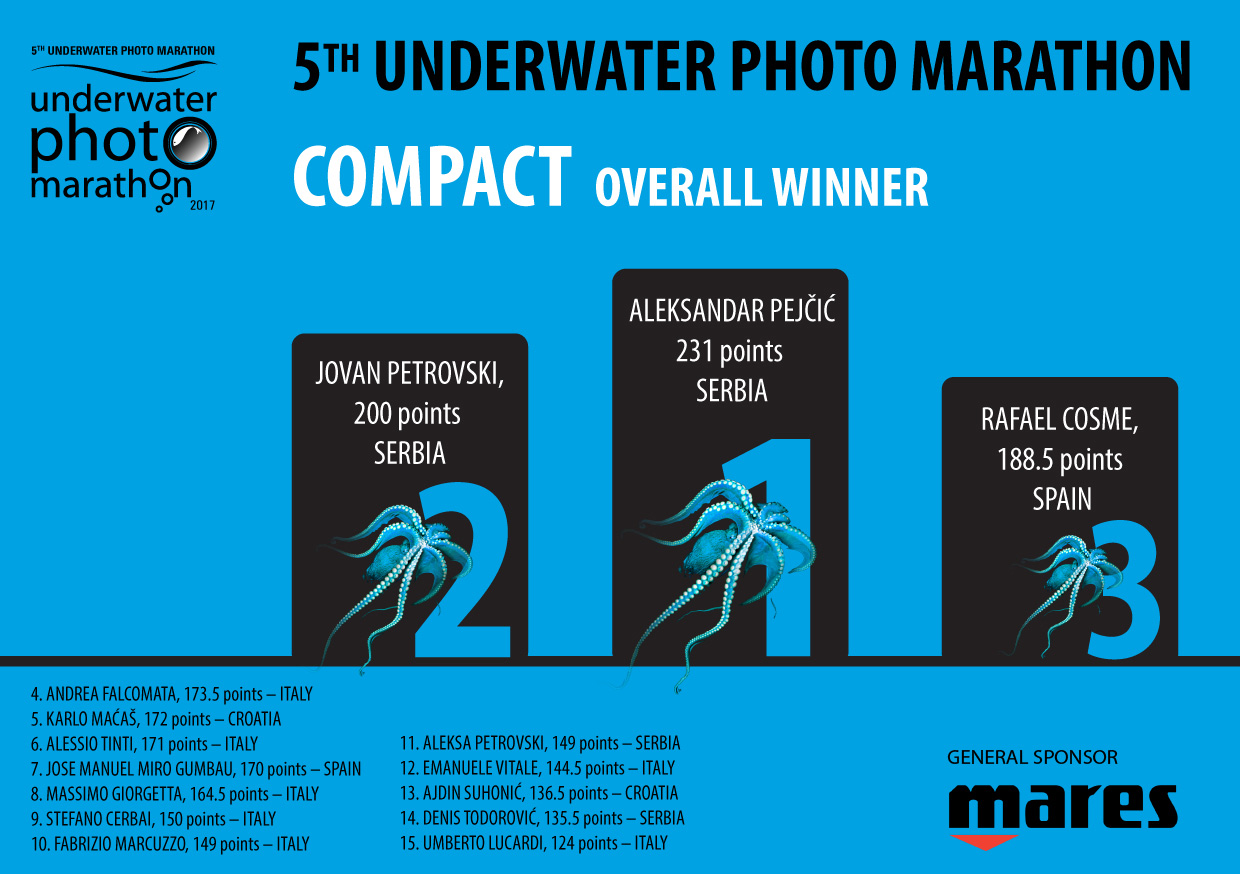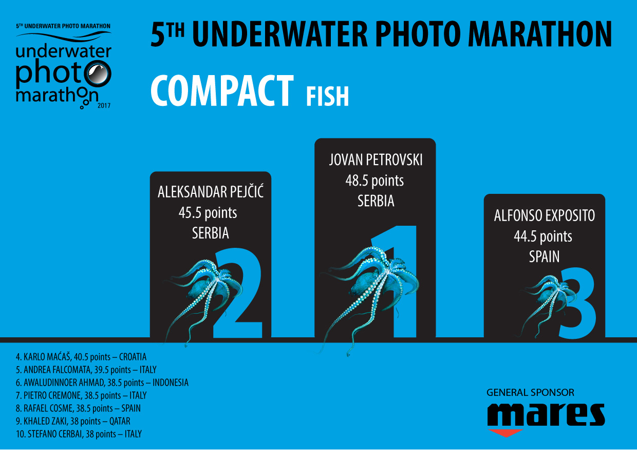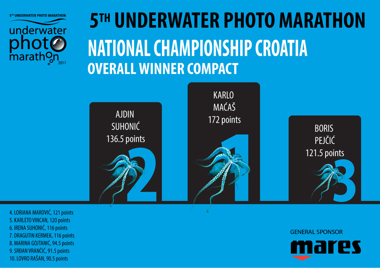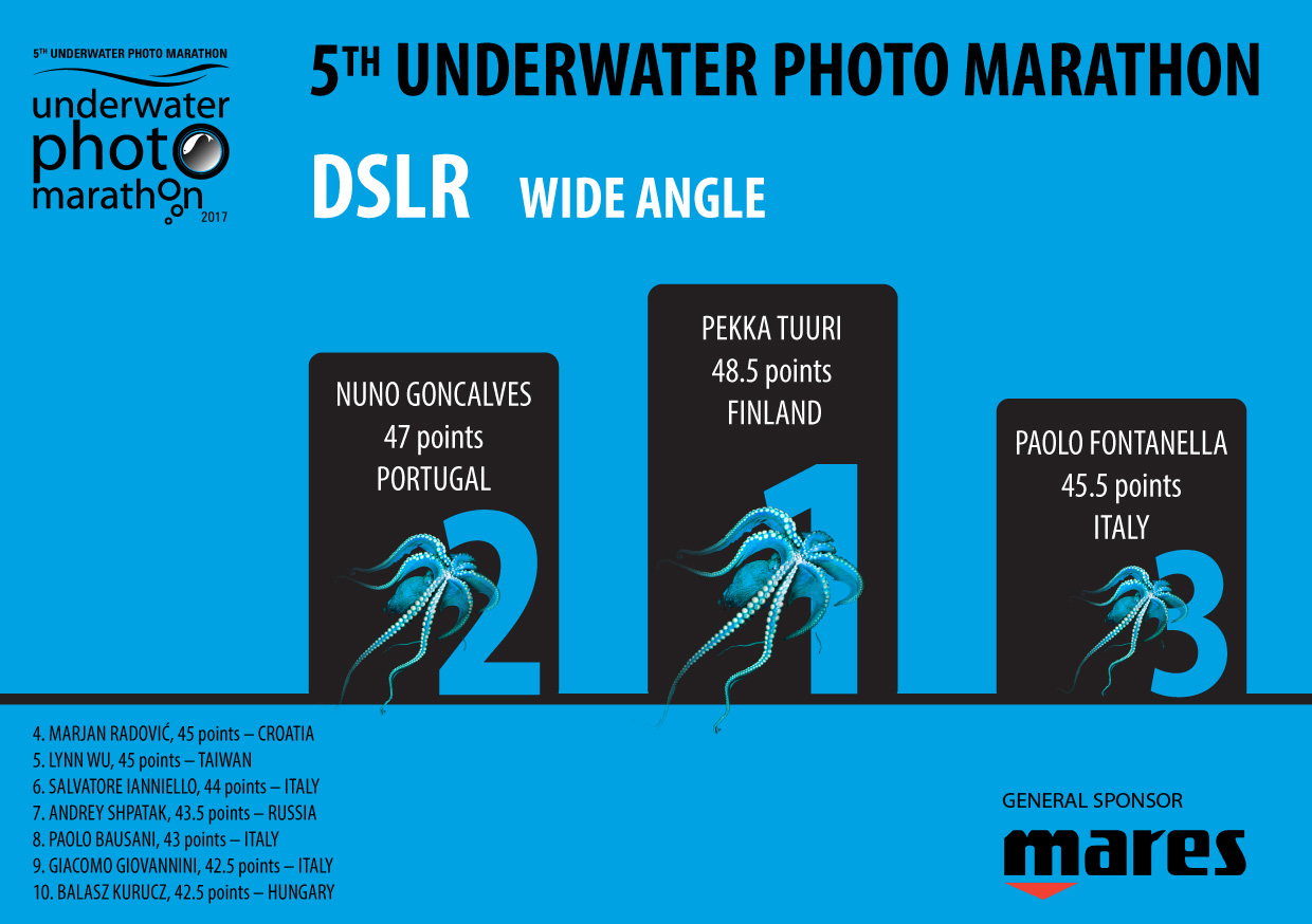 Čestitamo svim pobjednicima i svima koji su sudjelovali u 5. Underwater Photo Marathon-u 2017. Sudjelovalo je 343 natjecatelja iz 37 zemalja.Hvala što ste se odazvali u tolikom broju. Poslali ste ogroman broj zaista odličnih fotografija i žiri je imao poprilično težak posao.